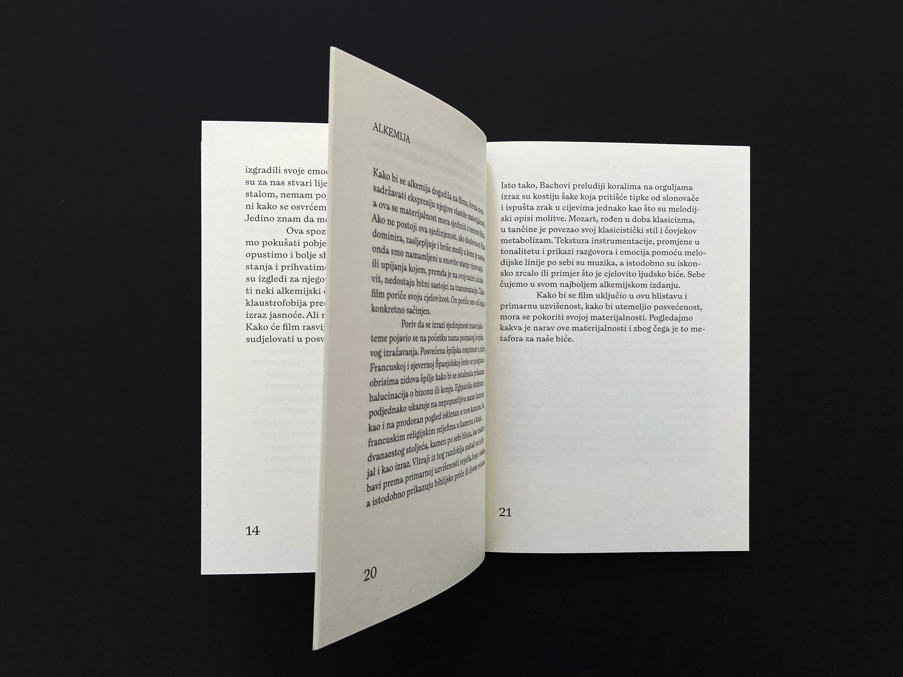 second edition of the Croatian translation of Nathaniel Dorsky’s “Devotional Cinema” / paper Peydur Feinlein 220g + Munken Pure 150g / typefaces Laica A by Dinamo type foundry / editor Petar Milat / editing and proofreadig Igor Marković and Ivor Glavaš / publisher Mama — Mutimedia institute Zagreb in cooperation with Klubvizija / 2020